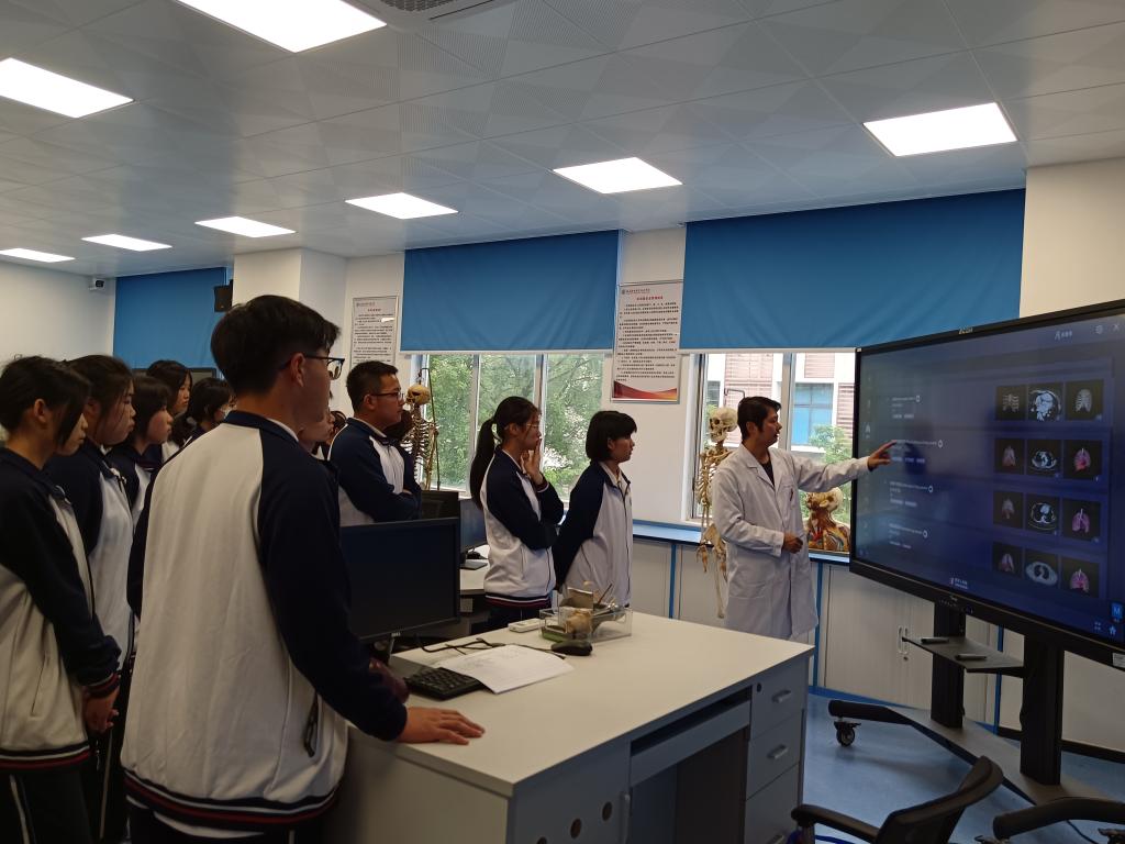 活動后,部分學(xué)生及閩侯縣職業(yè)中專學(xué)校師生代表參觀了解剖實(shí)訓(xùn)室。醫(yī)學(xué)院教師第二黨支部支委林加福老師作為志愿者引導(dǎo)講解形態(tài)學(xué)館標(biāo)本,帶學(xué)生體驗(yàn)使用示教儀、數(shù)字人軟件。學(xué)生們被多樣化的輔助教學(xué)信息化技術(shù)深深吸引。林加福鼓勵閩侯職專學(xué)生努力學(xué)習(xí),歡迎大家今后報(bào)考我校繼續(xù)學(xué)習(xí)。