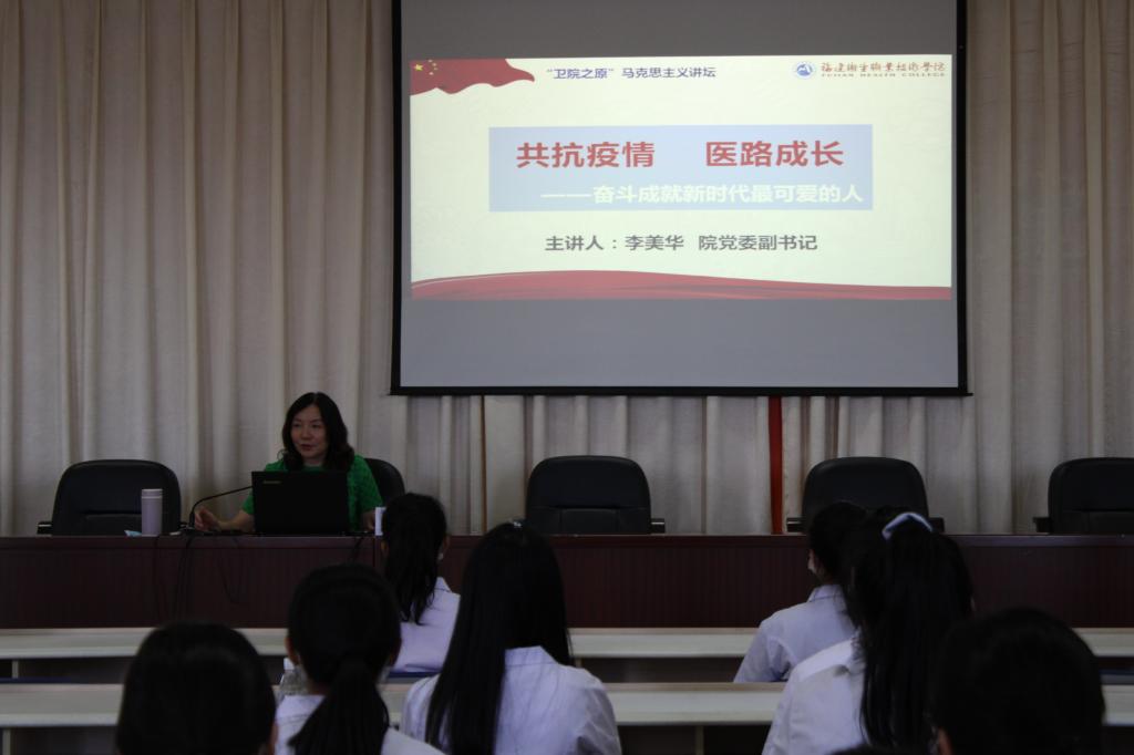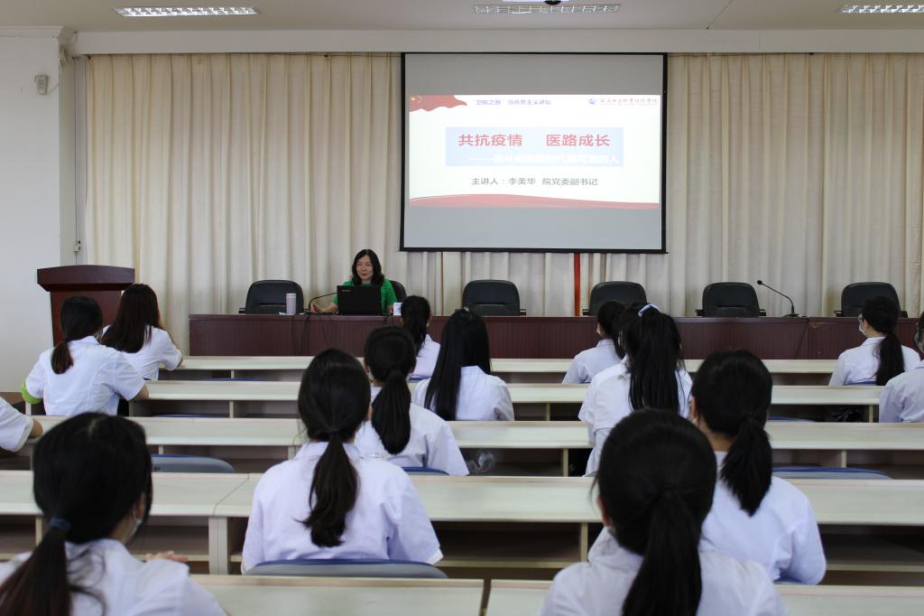 專題課圍繞當(dāng)下的疫情防控展開,分為三個(gè)部分:中央統(tǒng)一領(lǐng)導(dǎo)、精準(zhǔn)施策;疫情防控取得顯著成效、學(xué)校周密部署、分工明確,打響疫情防控的主動(dòng)戰(zhàn)和青春書寫擔(dān)當(dāng)、積極踐行,奮斗中做最美白衣天使。李美華副書記為大家簡要回顧了疫情經(jīng)過,用詳盡的數(shù)據(jù)列出了打贏疫情防控阻擊戰(zhàn)必勝信心之所在;同時(shí)從組織領(lǐng)導(dǎo)、宣傳引導(dǎo)和監(jiān)督檢查三個(gè)方面講述了學(xué)院為戰(zhàn)“疫”所做的努力,特別是學(xué)院校友馳援武漢、在基層一線戰(zhàn)“疫”的故事感動(dòng)了在場的學(xué)子們。她用鐘南山院士“選擇醫(yī)學(xué)可能是偶然,但你一旦選擇了,就必須用一生的忠誠和熱情去對(duì)待它”來勉勵(lì)大家在醫(yī)學(xué)的道路上奮勇前進(jìn)。專題課在《提燈女神》的優(yōu)美歌聲中結(jié)束。