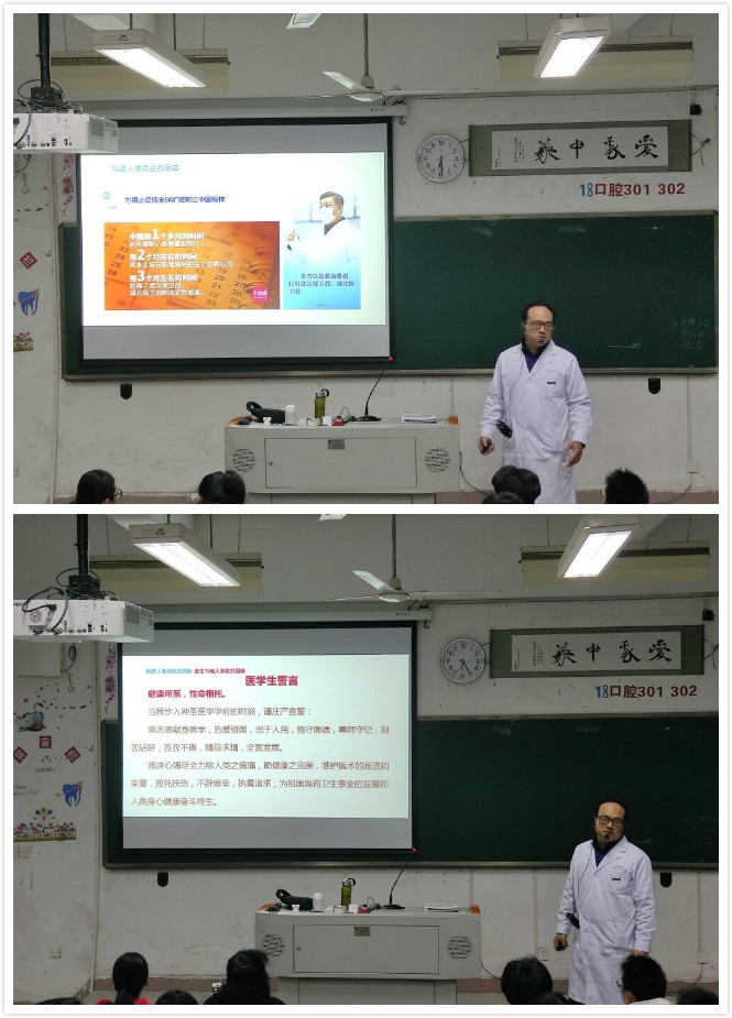 林國威副主任從為阻止疫情全球擴散樹立中國榜樣介紹起,分四個方面展開:人與自然,構成命運共同體、國與國,構成人類命運共同體、科學家與科學家,構成科技命運共同體以及醫(yī)生與病人命運共同體、教師與學生命運共同體;帶領同學們重溫了醫(yī)學上誓言,讓同學們深刻領會了決定你人生高度的,其實是你的學習力。