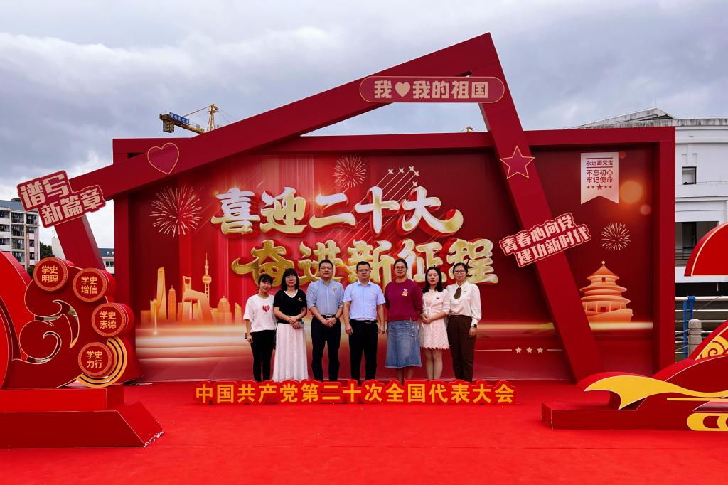 會后,在支部書記鄧元榮同志的帶領(lǐng)下,黨員同志在學校精心設(shè)置的主題陳展架前合影,記錄下這一心潮澎湃的激動時刻。