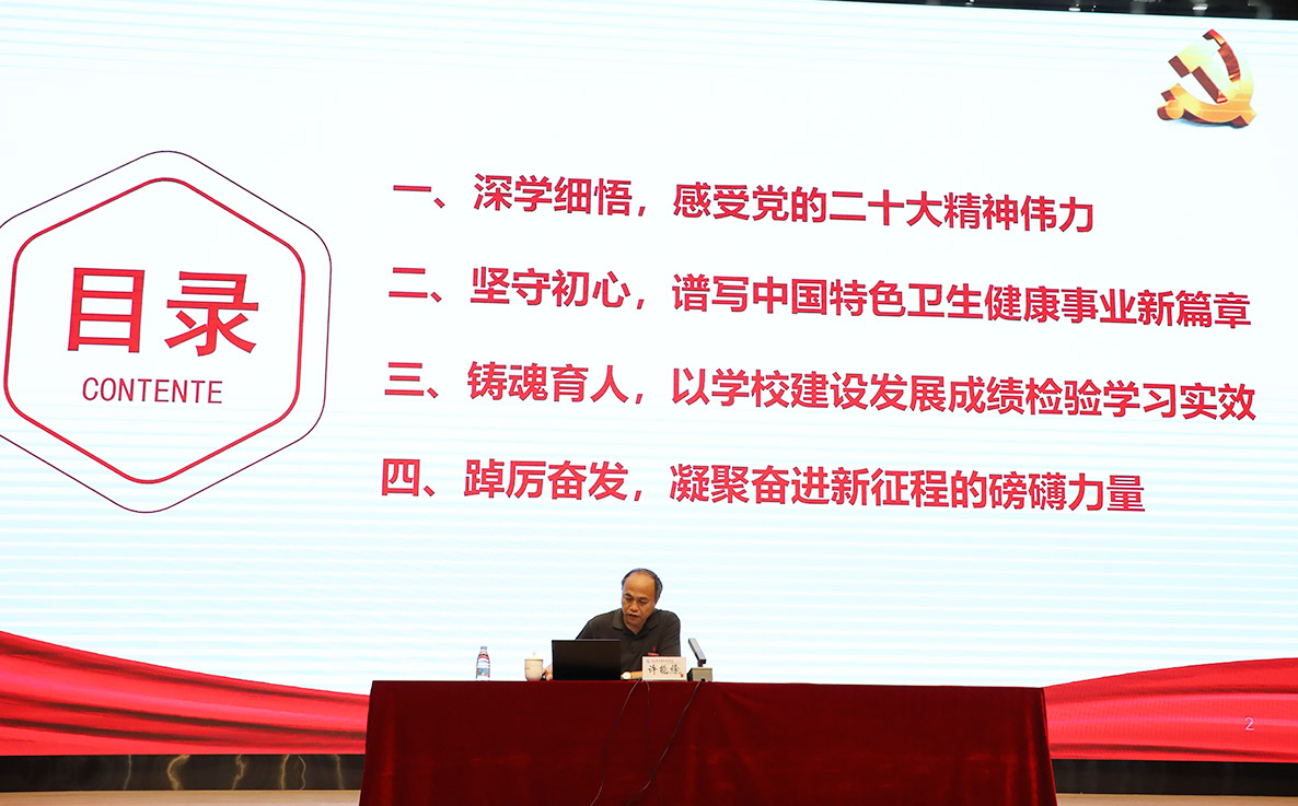 許能鋒以《砥礪奮進(jìn)啟新程 不忘初心鑄輝煌》為題,圍繞“深學(xué)細(xì)悟,感受黨的二十大精神偉力”“堅(jiān)守初心,譜寫中國(guó)特色衛(wèi)生健康事業(yè)新篇章”“鑄魂育人,以學(xué)校建設(shè)發(fā)展成績(jī)檢驗(yàn)學(xué)習(xí)實(shí)效”“踔厲奮發(fā),凝聚奮進(jìn)新征程的磅礴力量”四個(gè)方面,對(duì)黨的二十大精神進(jìn)行全面宣講和深入解讀。同時(shí),還結(jié)合我校的辦學(xué)特色,重點(diǎn)展示了在黨的領(lǐng)導(dǎo)下,學(xué)校十年來(lái)的建設(shè)發(fā)展成就。他強(qiáng)調(diào),學(xué)習(xí)好、宣傳好、貫徹好黨的二十大精神,是當(dāng)前和今后一個(gè)時(shí)期的首要政治任務(wù)。要學(xué)深悟透,通過(guò)全面學(xué)習(xí)、全面把握、全面落實(shí),迅速興起學(xué)習(xí)貫徹黨的二十大精神熱潮。