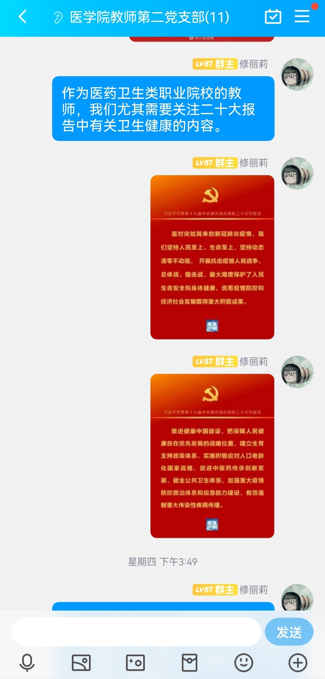 修麗莉在支部工作群在線組織學(xué)習(xí)習(xí)近平總書記在黨的二十大上作的報告和大會精神,本次學(xué)習(xí)主要聚焦黨的二十大報告中有關(guān)衛(wèi)生健康的內(nèi)容。她認(rèn)為,黨的二十大報告強(qiáng)調(diào),推進(jìn)健康中國建設(shè),把保障人民健康放在優(yōu)先發(fā)展的戰(zhàn)略位置。作為醫(yī)藥衛(wèi)生類職業(yè)院校的教師,我們需要關(guān)注和思考,如何為醫(yī)療衛(wèi)生健康行業(yè)培養(yǎng)更多的合格專業(yè)人才。
