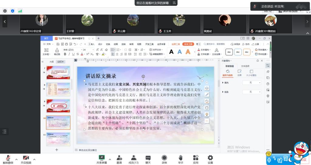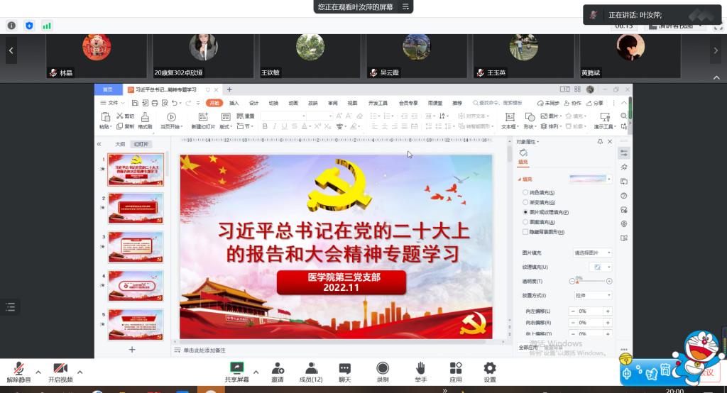 為深入貫徹落實黨的二十大精神,2022年11月4日,醫(yī)學(xué)院教師第三黨支部召開黨員大會,組織全體黨員專題學(xué)習(xí)習(xí)近平總書記在黨的二十大上作的報告和大會精神,本次學(xué)習(xí)主題為第二部分內(nèi)容“開辟馬克思主義中國化時代化新境界”,由支部副書記葉汝萍主持。