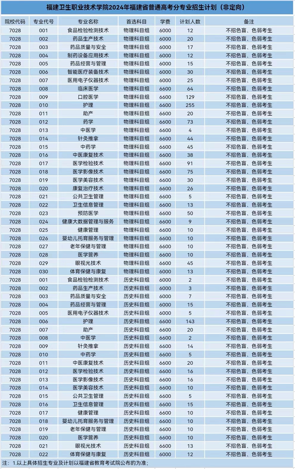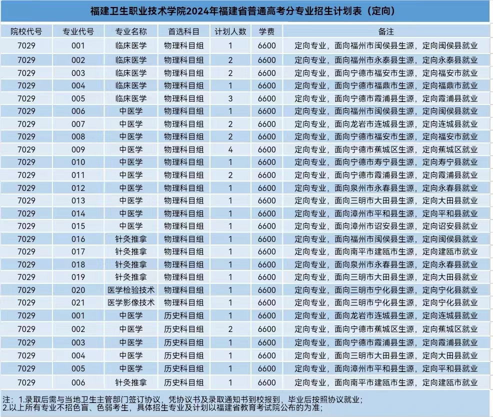 福建衛(wèi)生職業(yè)技術學院2024年福建省普通高考分專業(yè)招生計劃