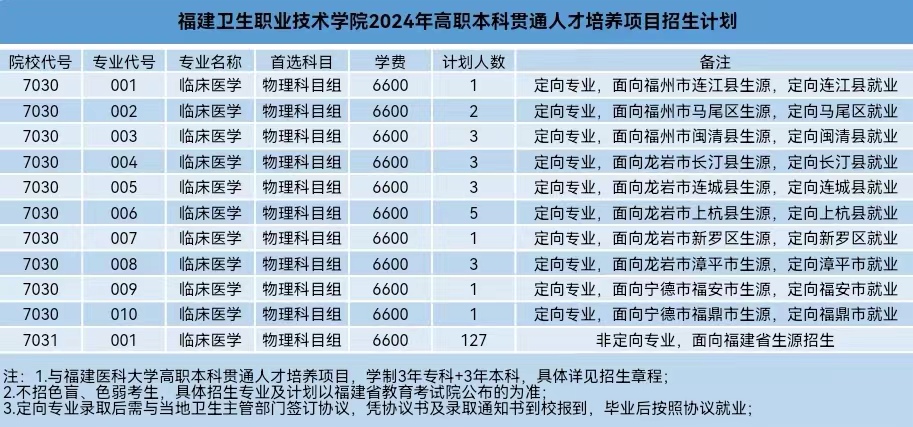 福建衛(wèi)生職業(yè)技術學院2024年五年制高等職業(yè)教育招生計劃